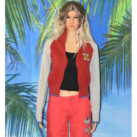 Gilet zippé de la marque School Rag, coloris rouge et gris, écriture au dos.