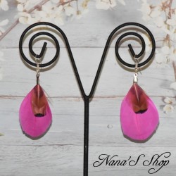 • Boucles d'oreilles duo de plumes simple, coloris rose fuchsia.