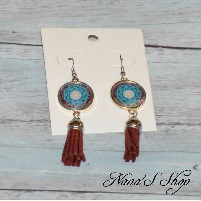 Boucles d'oreilles pendantes dans le thème bohème en métal argenté, cabochons en résine motif rosace colorée et pompons tassel en suédine (imitation daim) de couleur assortie.