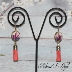 Boucles d'oreilles pendantes dans le thème bohème en métal argenté, cabochons en résine motif plume colorée et pompons tassel en suédine (imitation daim) couleur assortie.