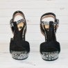 Sandales à talon, de la marque Desigual, modèle Vela Alhambra, en suédine noire et motif fleur géométrique coloris noir et blanc.