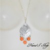 Collier et pendentif, en métal argenté, estampe en filigrane, finition breloques en forme de Boucles d'oreilles, hexagone en nacre orange..